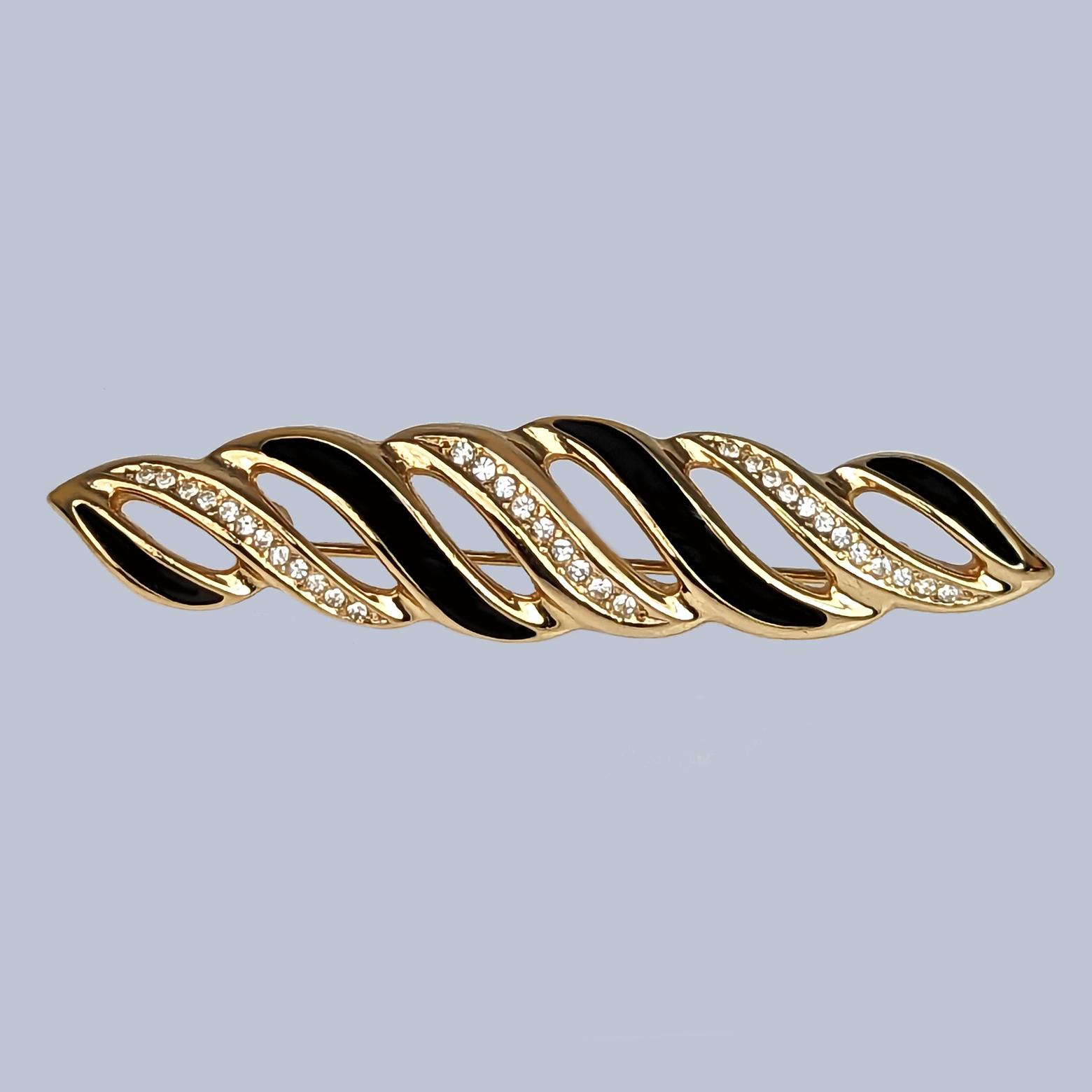 Vintage Christian Dior Crystal & Black Enamel Gold Tone Swirl Bar Brooch 1980s