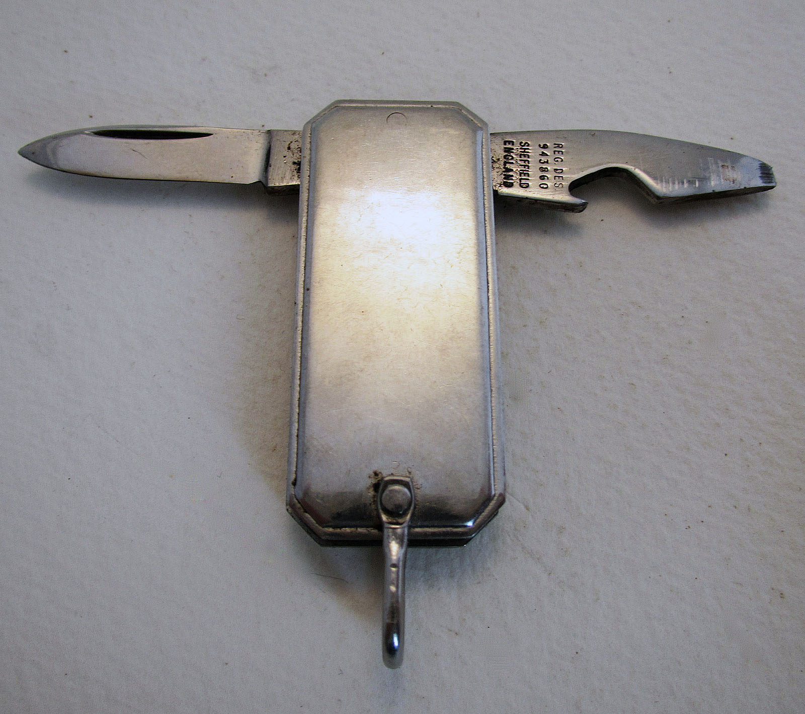 Vintage Combination Pocket Double Folding Penknife Fruit Knife Bottle Opener Keychain Fob Art Deco Sportsman Sheffield England. Stainless Steel c.1930
