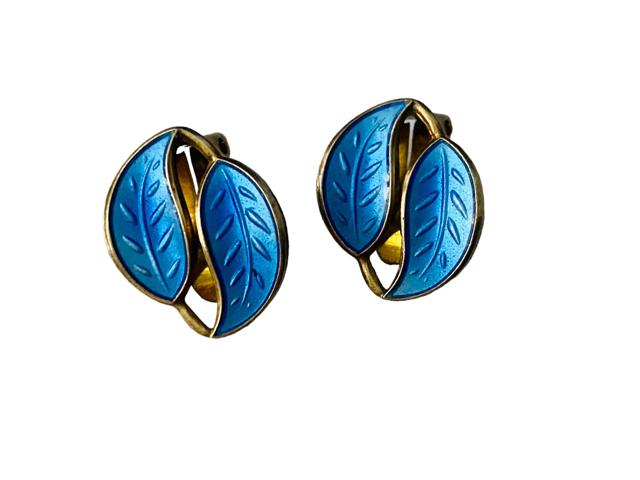 Vintage David Andersen Sterling Silver Gilt Guilloche Enamel Double Leaf Clip On Earrings Circa 1940 (1 of 5)