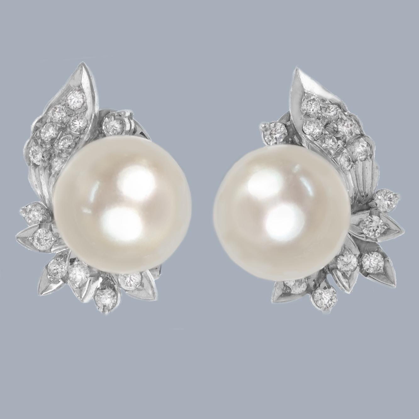 Vintage Diamond and Pearl Earrings 1950s 14ct White Gold Floral Diamond Earrings