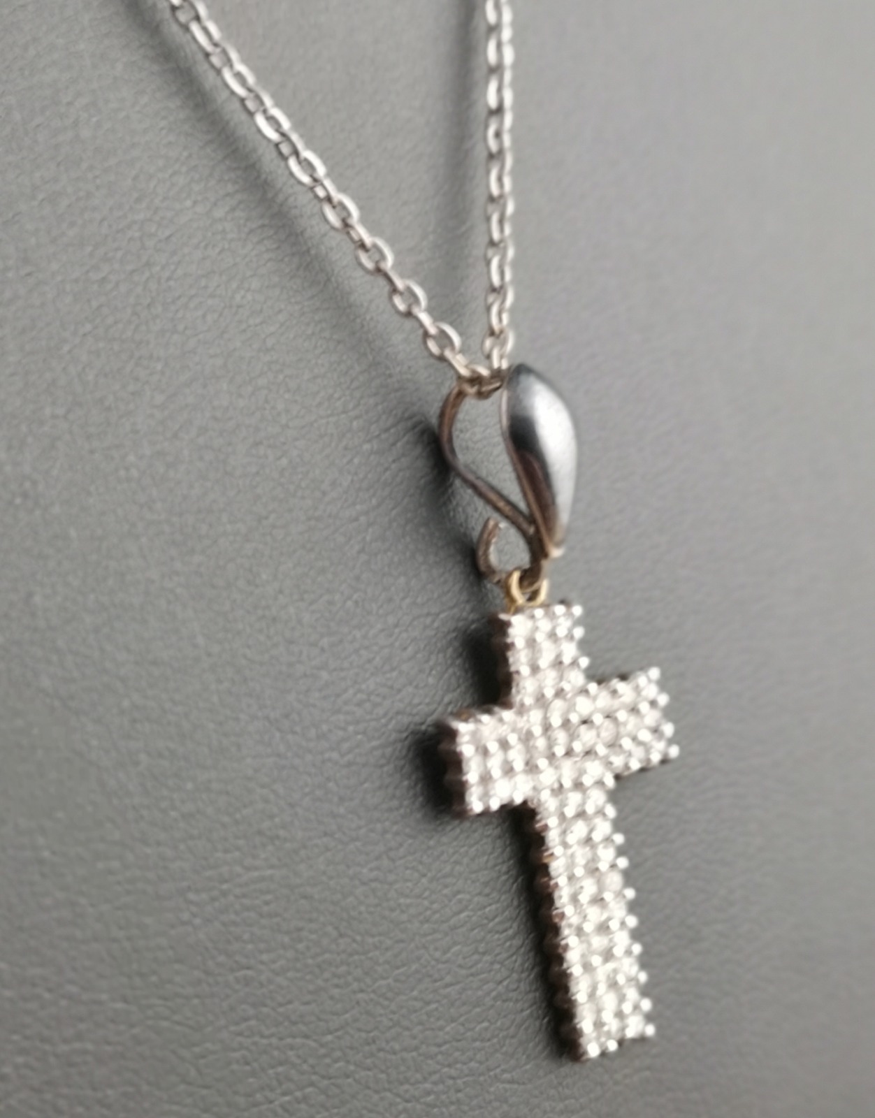 Vintage Diamond Crucifix, Art Deco Silver & Niello Chain, Pave Diamond Cross Necklace