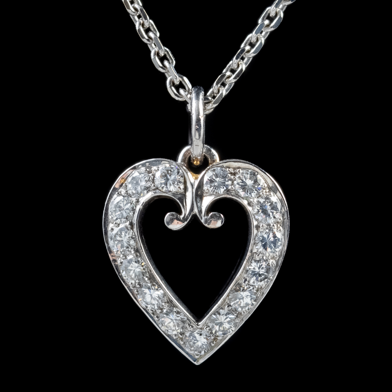 Vintage Diamond Heart Pendant Necklace 18ct White Gold Chain 1.20ct of Diamond