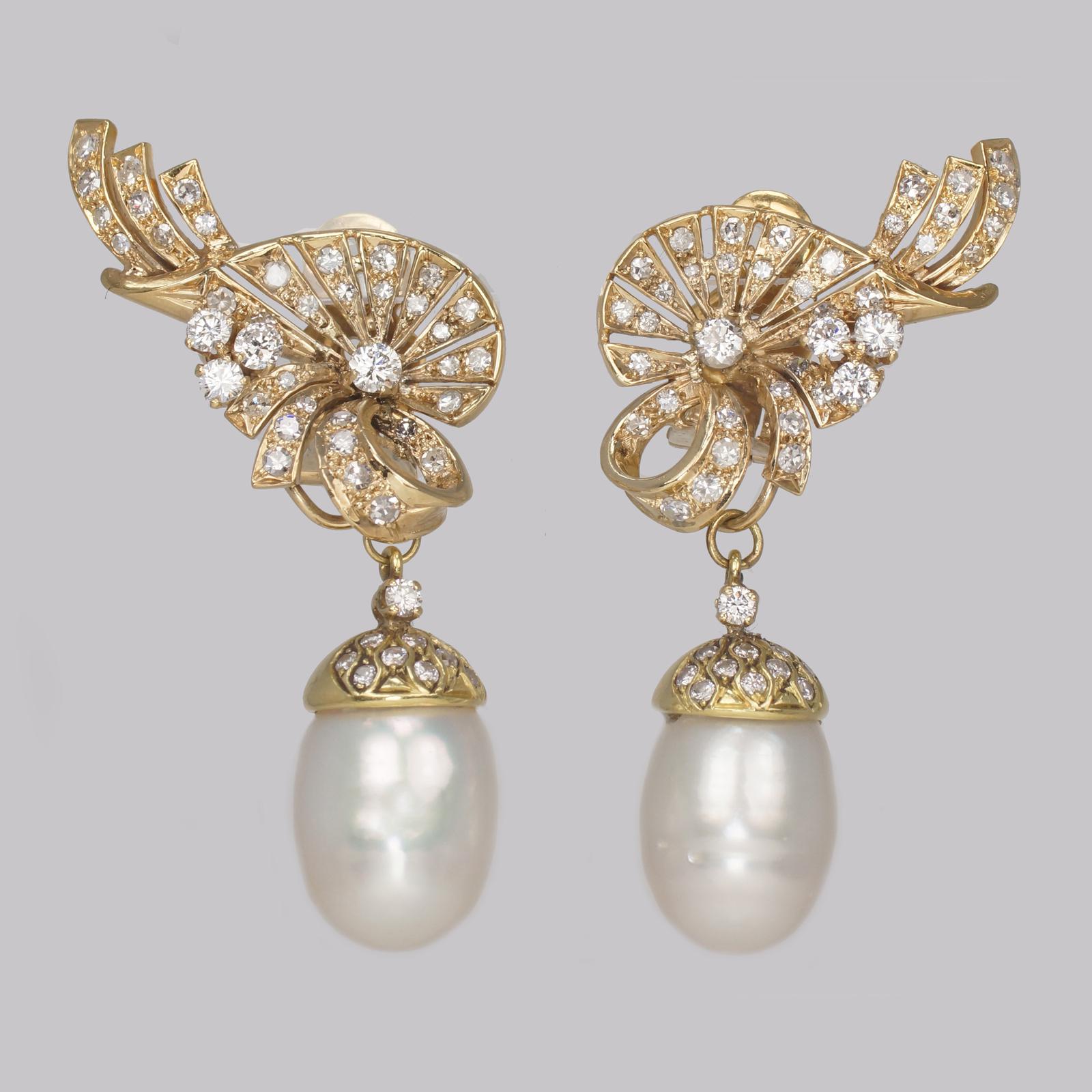 Vintage Diamond & Pearl Drop Earrings 1950s 18ct Gold 3.5carat Diamond Earrings