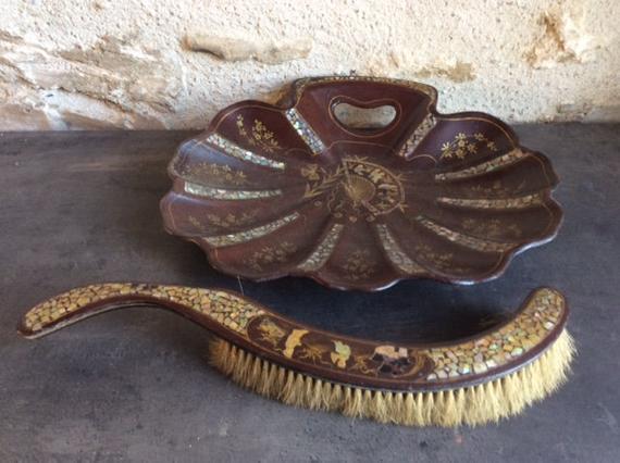 Vintage Early 20th Century Chinese Indo Chinese Papier Mache & Mother of Pearl & Gilt Scallop Shell Shape Crumb Tray & Brush