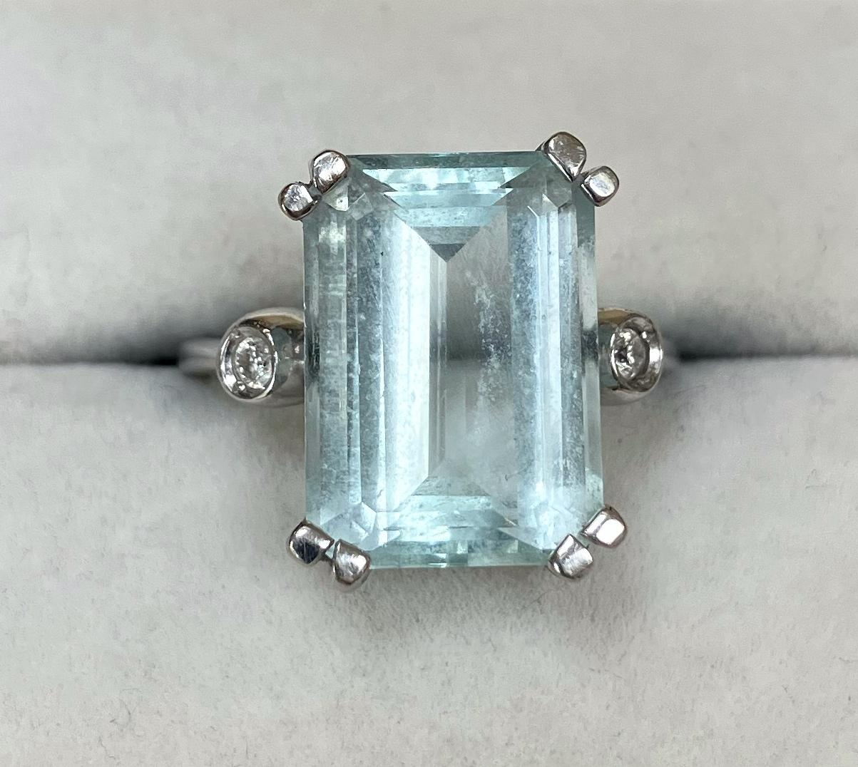 Vintage Emerald Cut Aquamarine & Diamond Ring - Size L