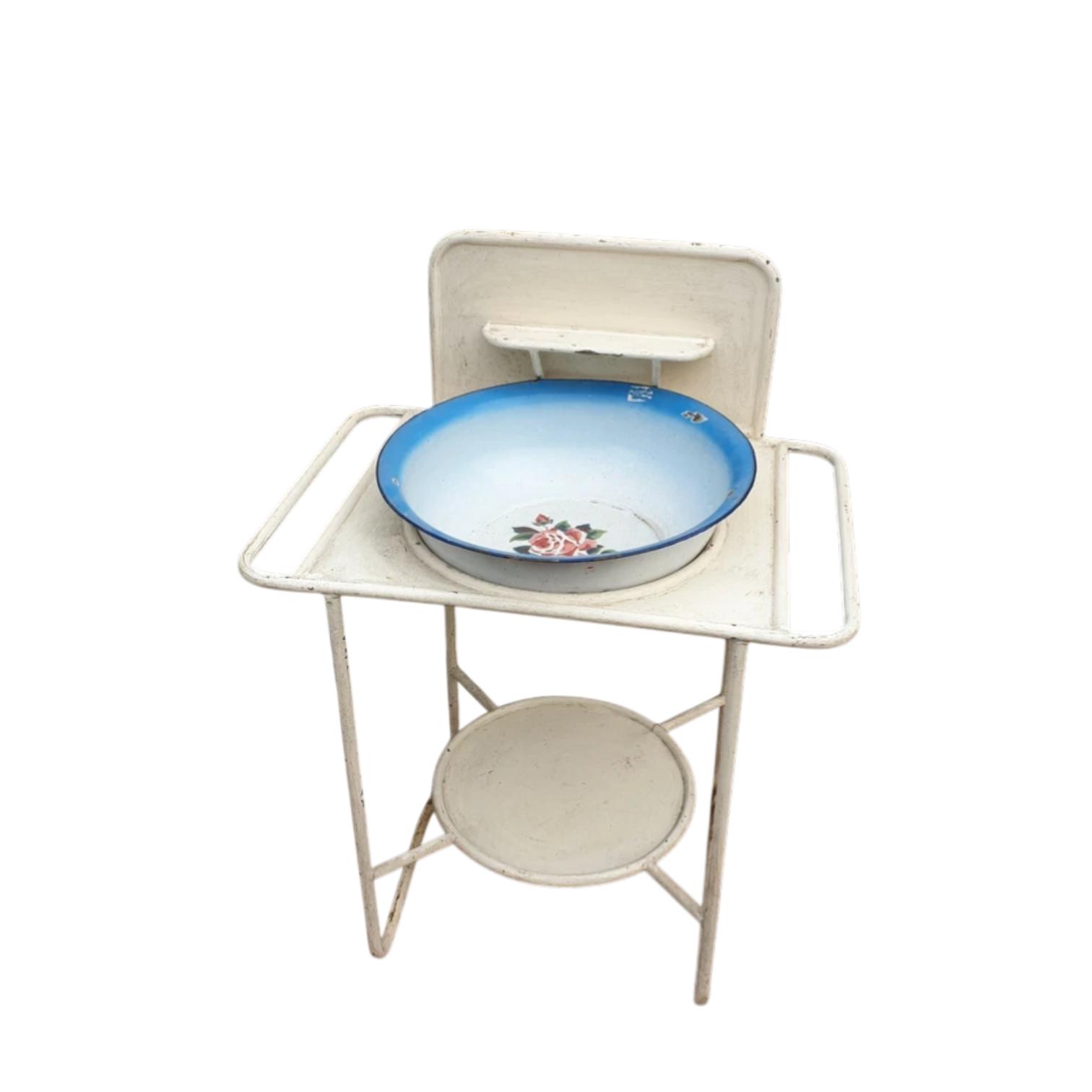 Vintage Enamel Wash Basin Stand with Original Bowl – Farmhouse Primitive Bathroom Piece