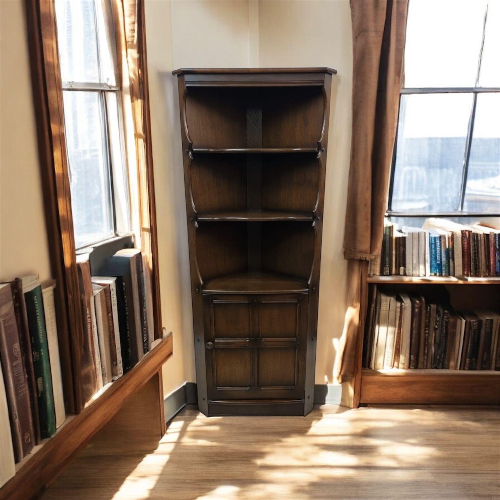 A superb 1970s Ercol corner cabinet, crafted in solid elm and displaying the brand’s signature sculpted lines and beautiful grain patterns.
