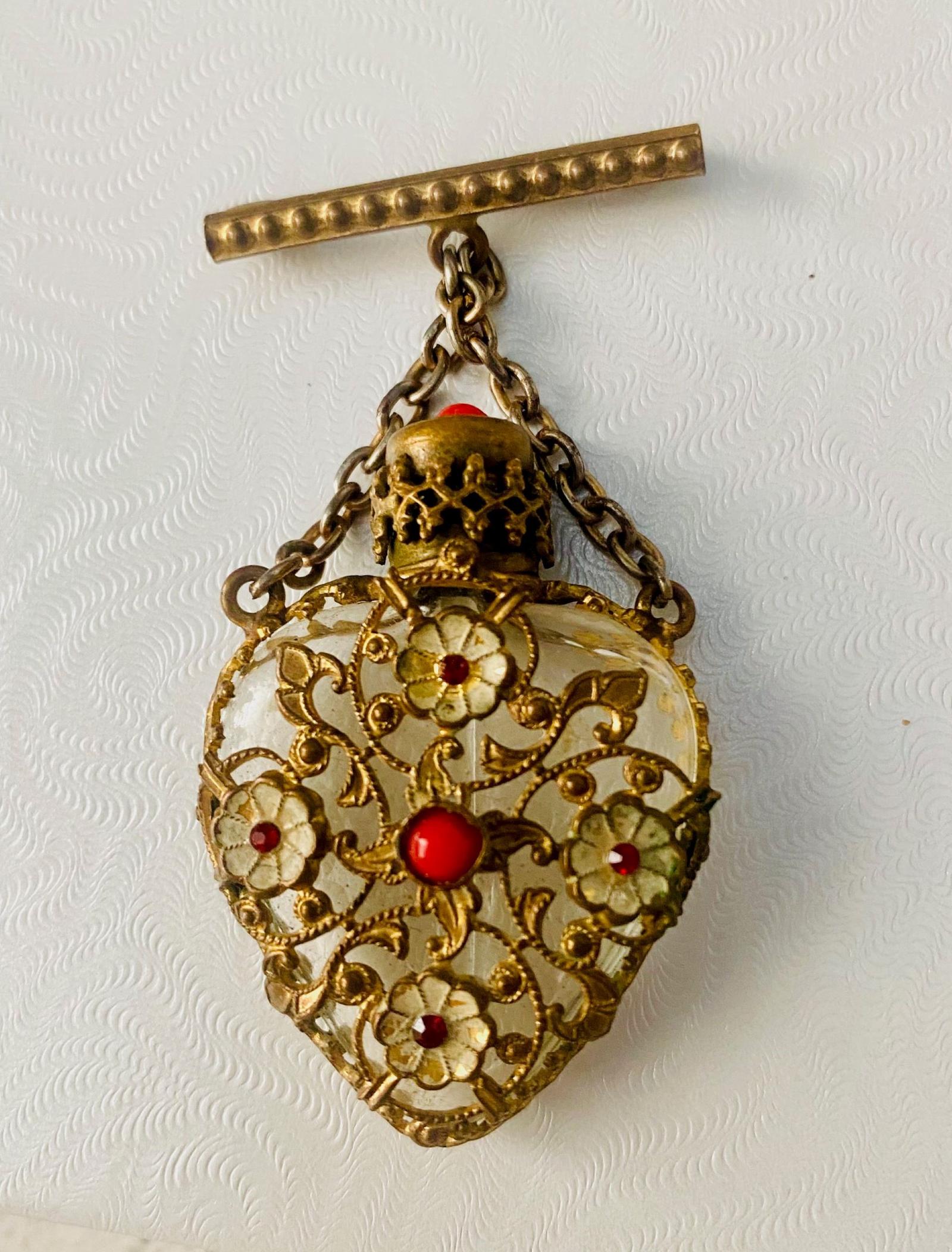 Vintage Filigree Metal Enamel & Jewelled Pendant Perfume Scent Bottle Brooch / Pin Circa 1940