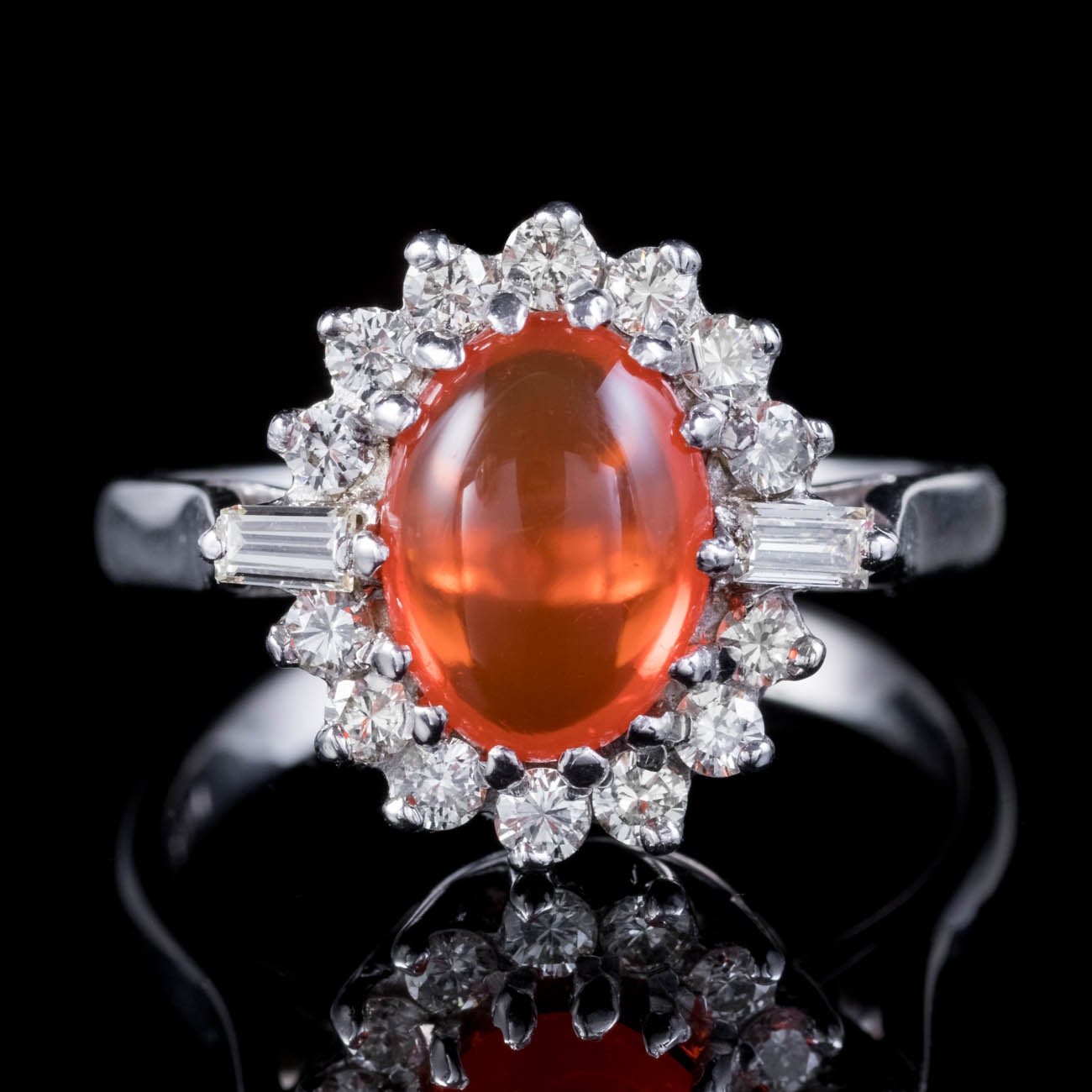 Vintage Fire Opal Diamond Cluster Ring 18ct White Gold 1.75ct Opal 1.20ct Diamonds