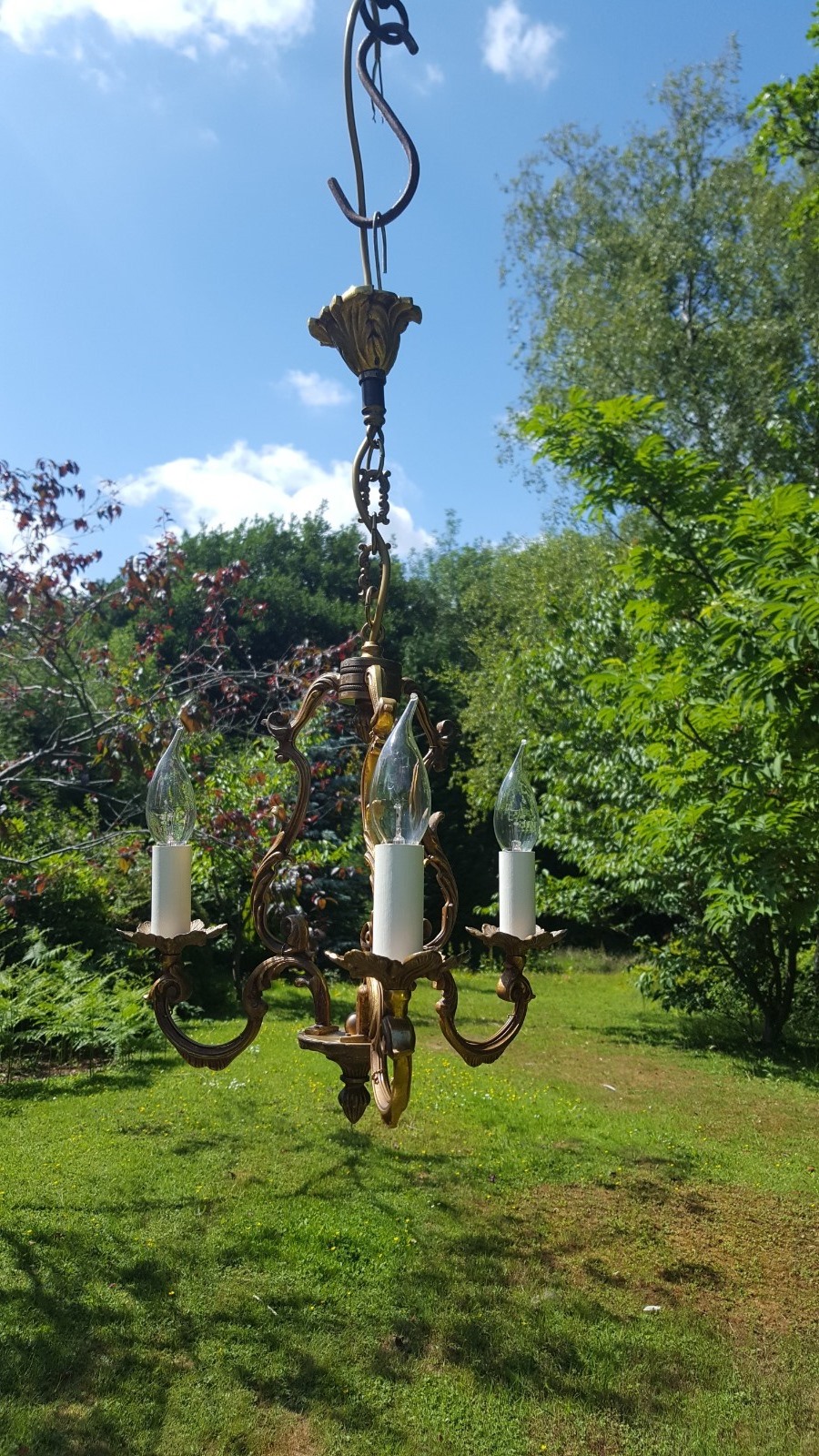 Vintage French 1950s 3 Arm Bronze Cage Chandelier