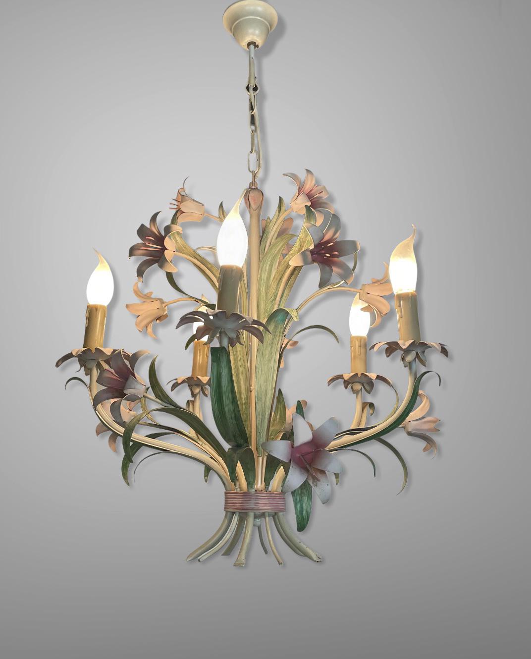 Vintage French 5 Arm Floral Toleware Ceiling Light Chandelier