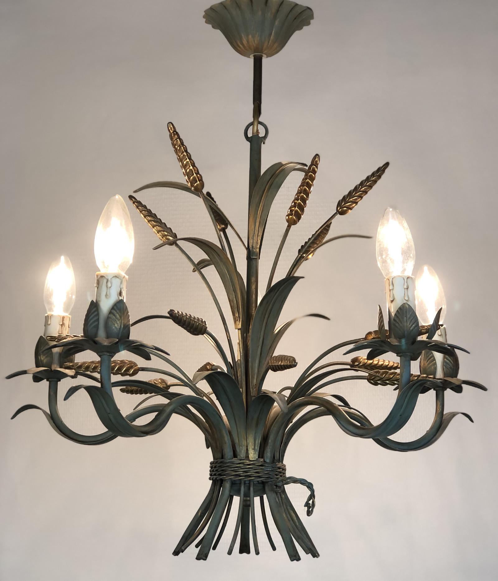 Vintage French 5 Arm Green / Gilt Wheatsheaf Toleware Chandelier