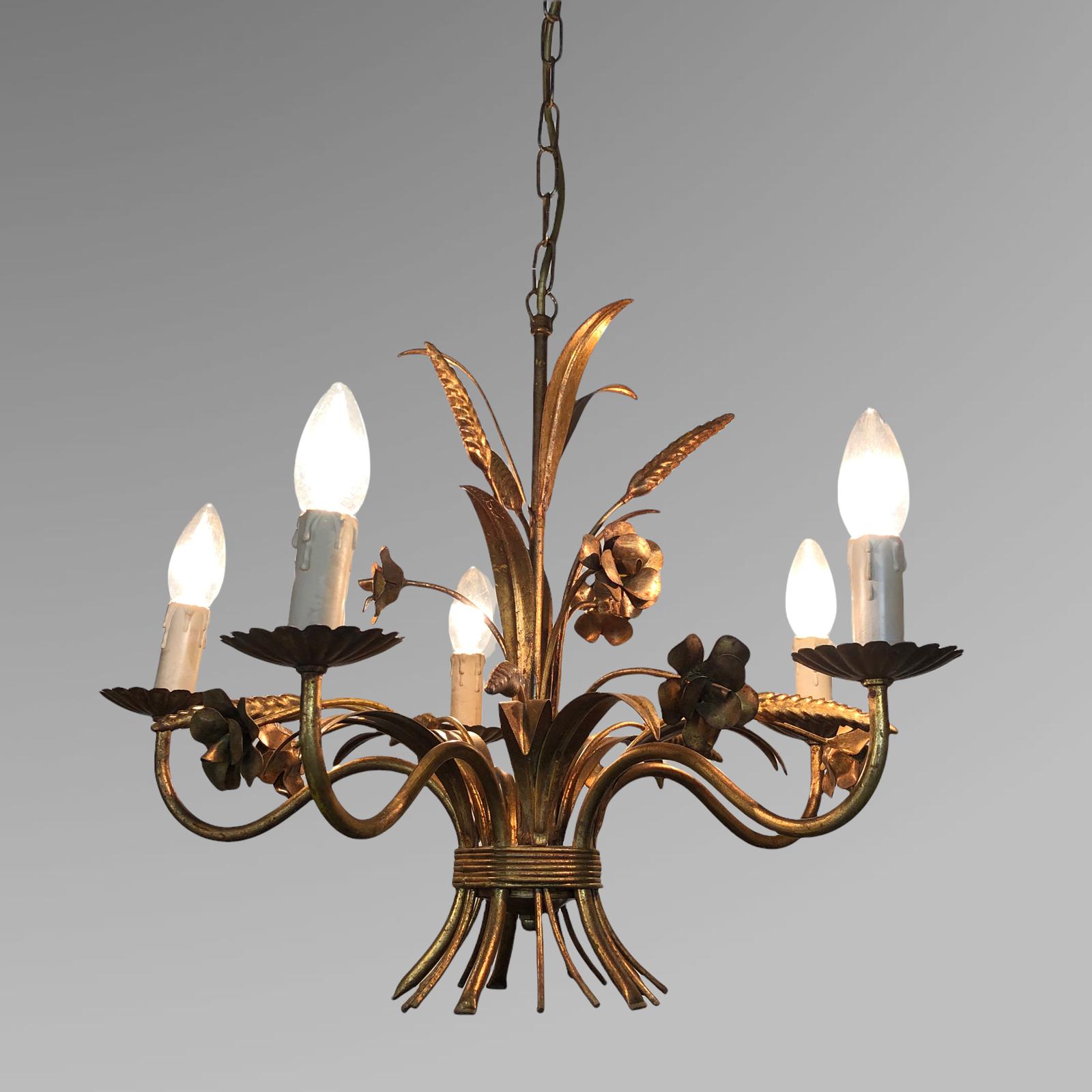 Vintage French 5 Arm Tied Bouquet Gilt Toleware Ceiling Light