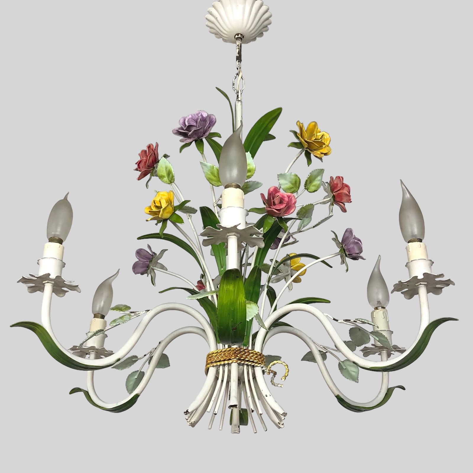 Vintage French 6 Arm Toleware Chandelier Tied Bouquet Floral