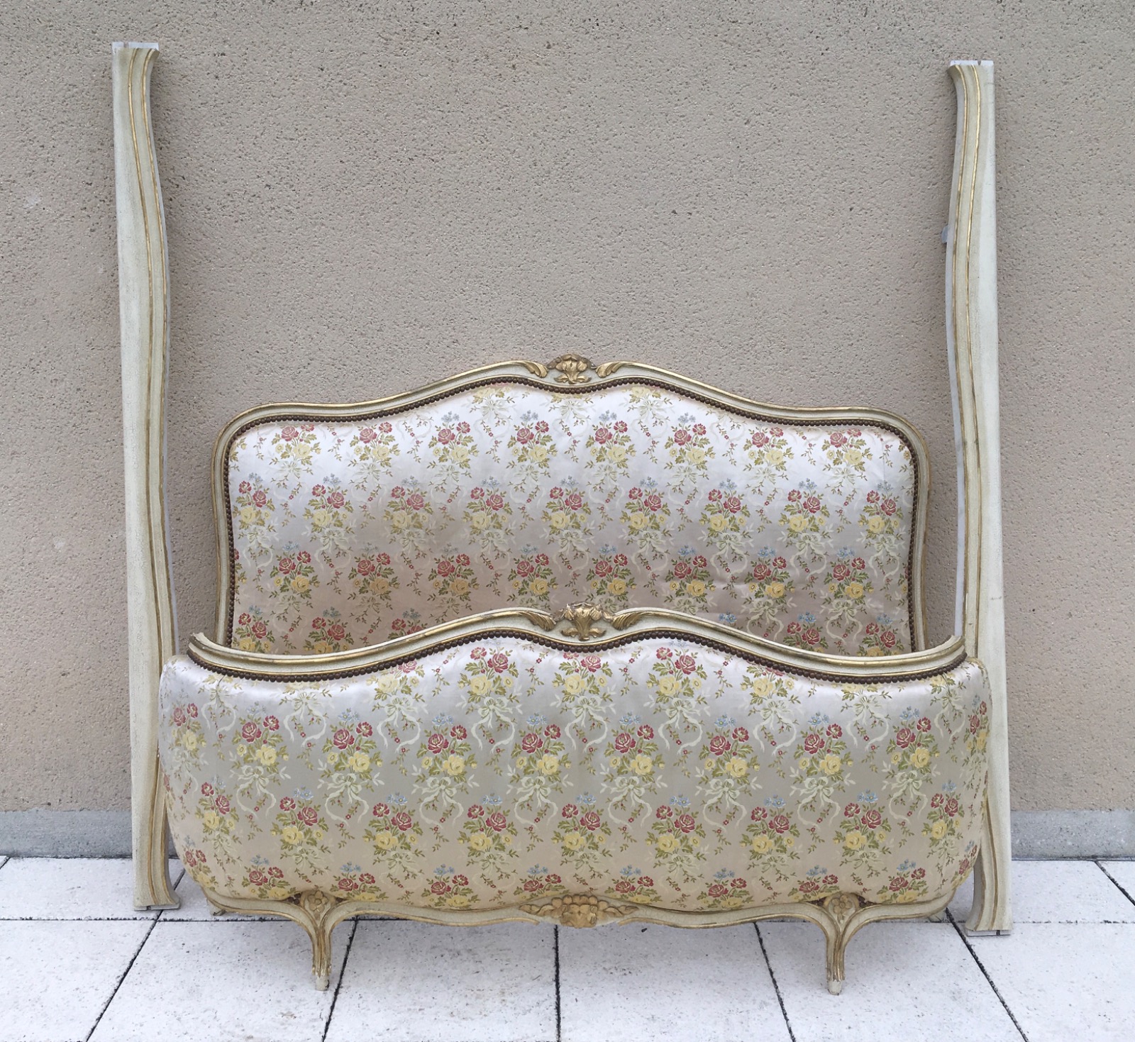 Vintage French Demi Corbeille Upholstered Double Bed Frame Louis XV Style