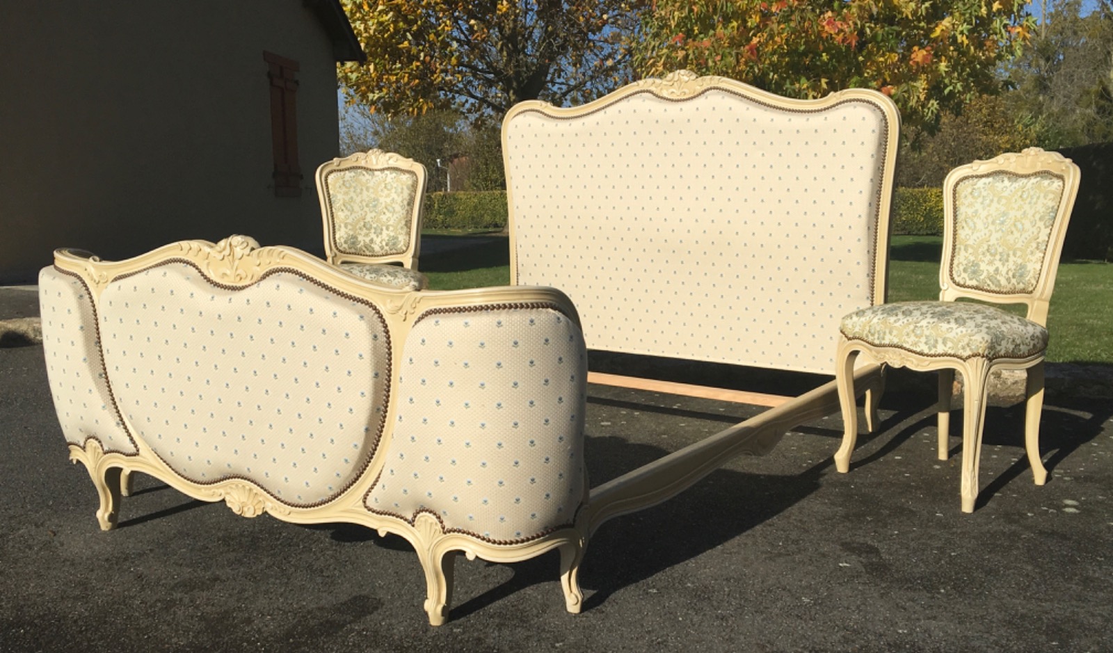 Vintage French Demi Corbeille Upholstered Double Bed Frame with Matching Chairs