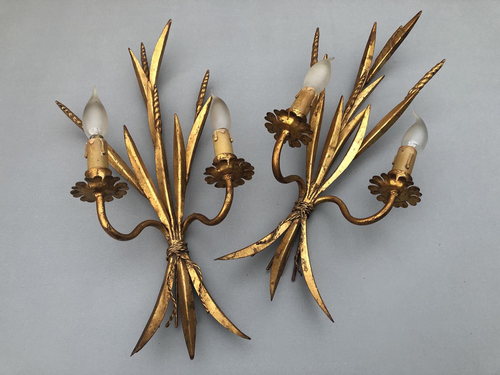 Vintage French Gilt Toleware Wheat Sheaf Wall Lights Sconces