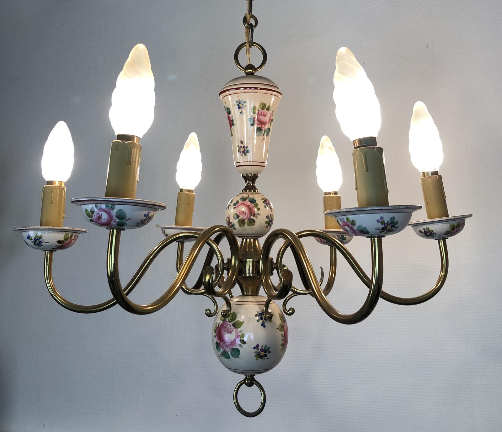 Vintage French Large Porcelain & Brass 6 Arm Flemish Chandelier