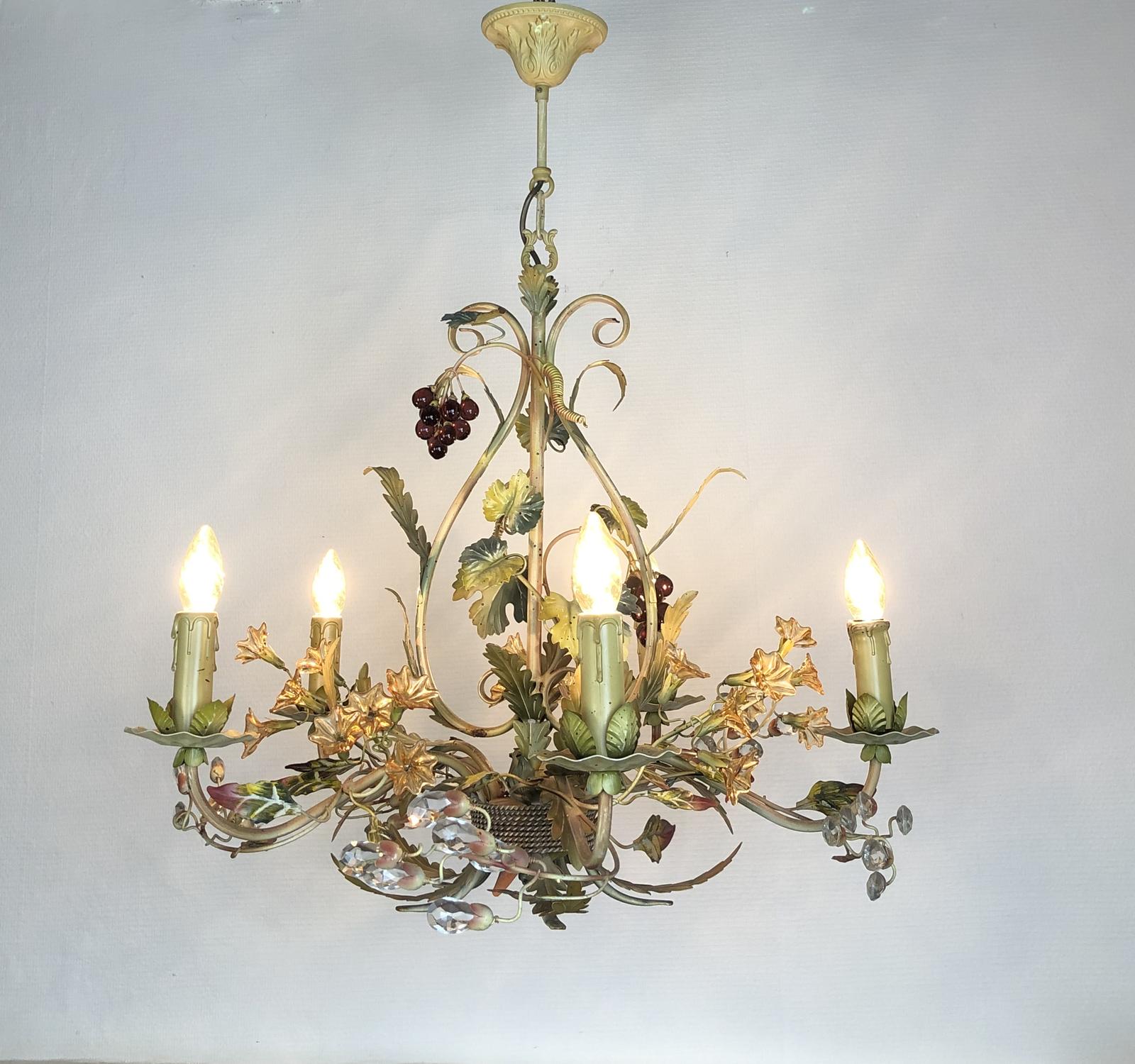 Vintage French Large Toleware Ceiling Light Chandelier with Grapes & Flowers