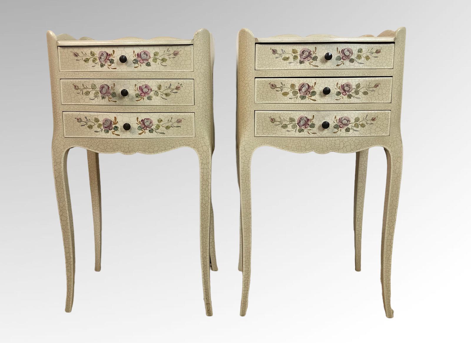 Vintage French Louis Style Craquelure Cabinets Bedside Tables with Floral Detail