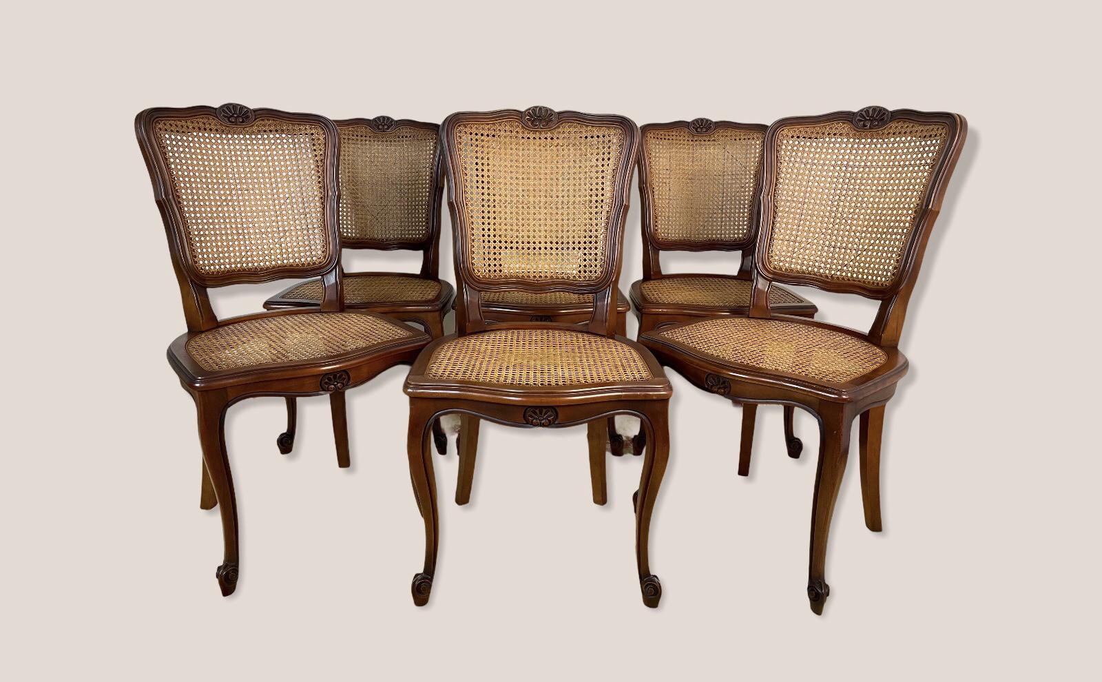 Vintage French Louis Style Set Of 6 Cherry Wood Bergère Cane Dining Chairs
