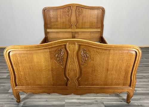 Elevate your bedroom with this elegant vintage French Louis oak double bed, masterfully crafted from solid oak. This timeless piece showcases intricately carved panels with flowing floral motifs, gracefully curved headboard and footboard, and classic cabriole legs that embody the sophistication of French Louis design. The warm oak finish highlights the natural wood grain, giving it a rich and luxurious patina. Perfect for traditional, classic, or French-inspired interiors, this bed frame beautifully combines style and durability.