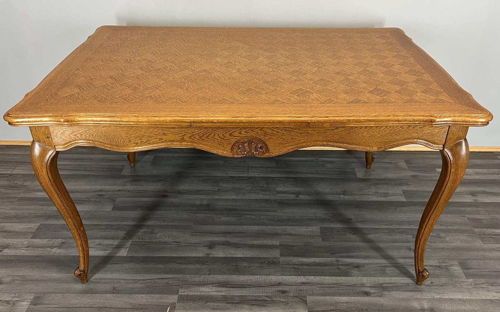 Vintage French Oak Extendable Dining Table Parquet Top Cabriole Legs –