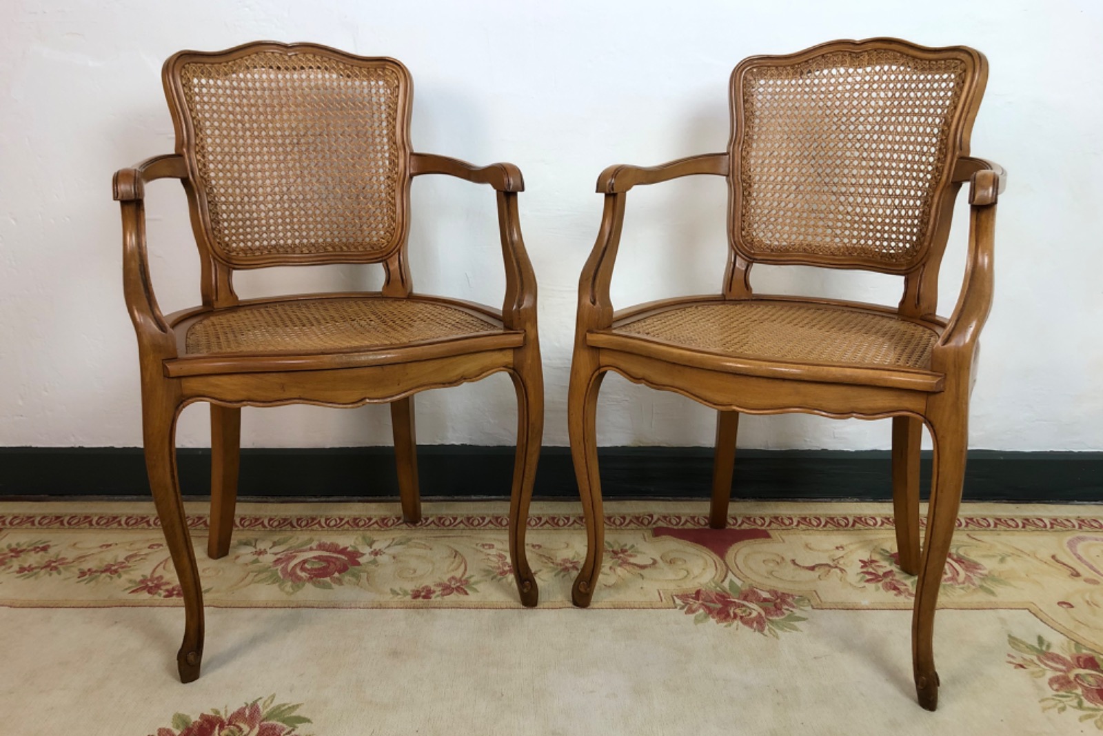 Vintage French Pair of Bergère Cane Dining Carver Chairs Louis Style