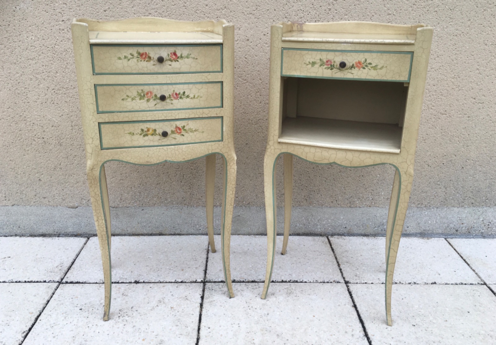 Vintage French Pair of Shabby Chic Bedside Tables