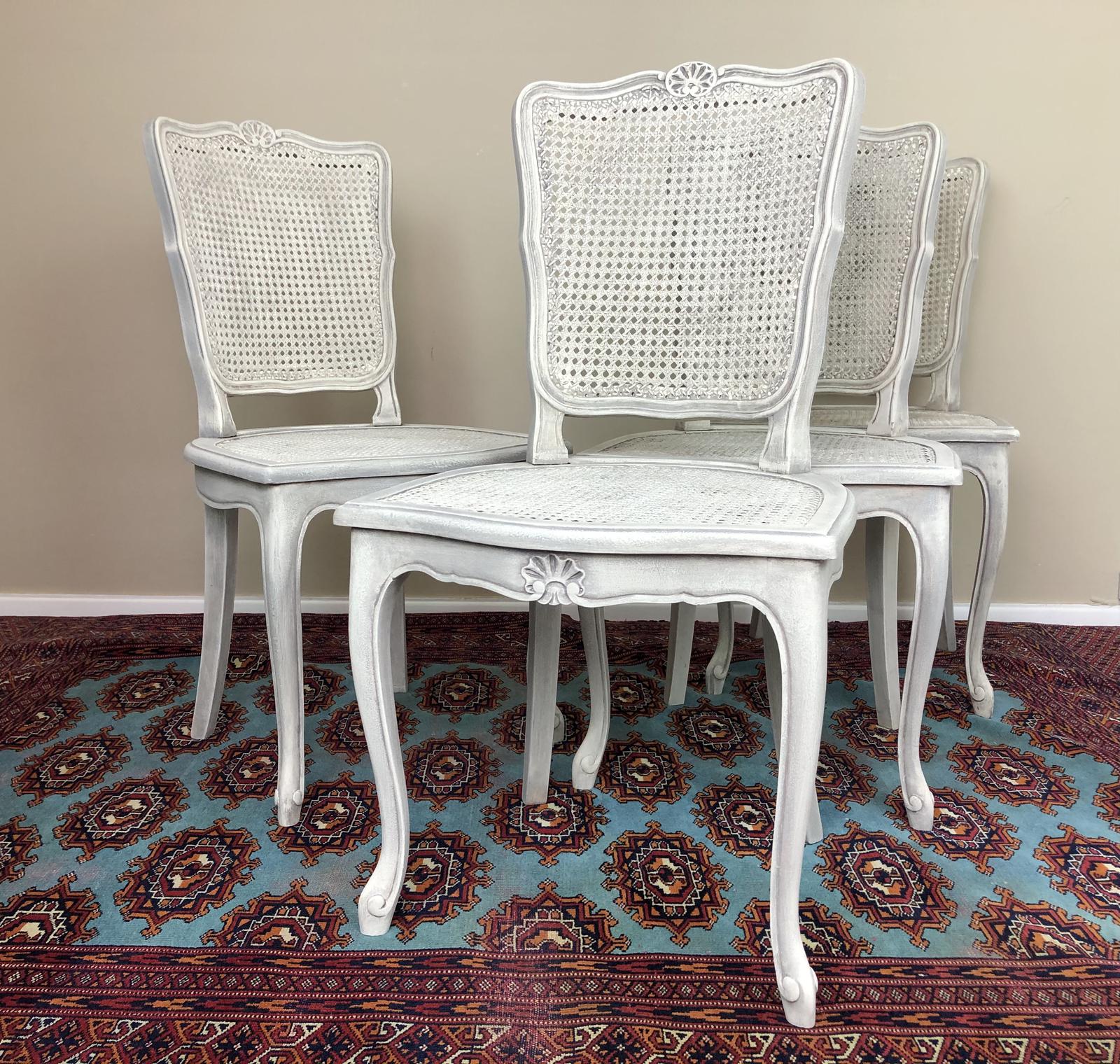 Vintage French Set of 4 Bergère Cane Dining Chairs Painted in Weathered Grey