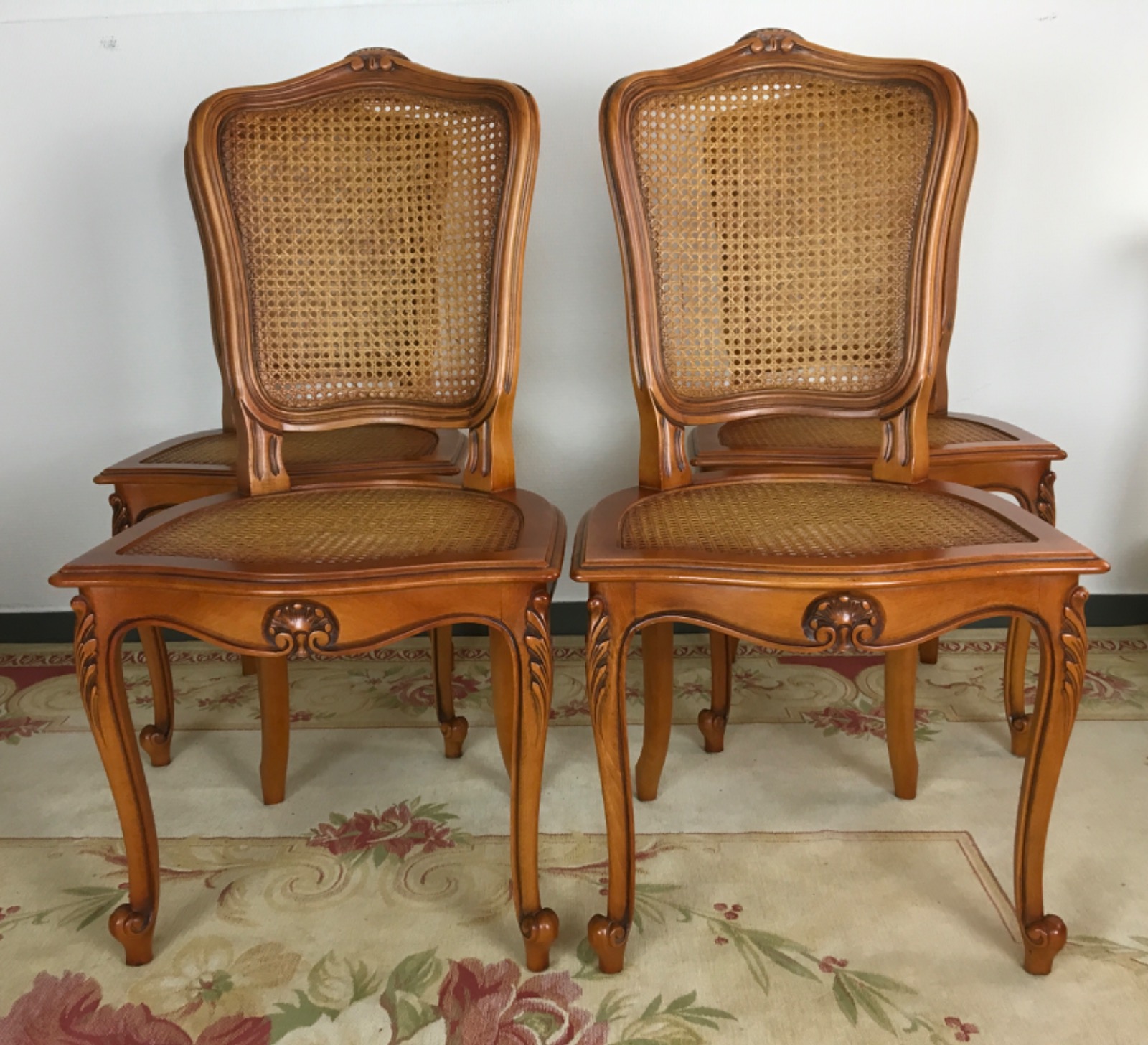 Vintage French Set of Four Bergère Cane Dining Chairs Louis XV Style