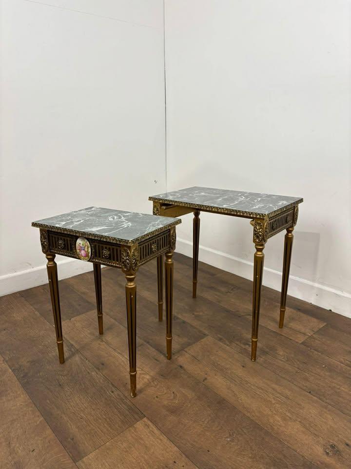 A charming pair of vintage French style nest tables featuring decorative gilt-painted frames and faux marble tops. Elegant and practical, these tables slide neatly together when not in use, making them ideal for smaller spaces while still offering extra surface space when needed.