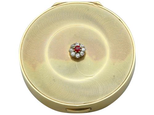 An exceptional, fine and impressive vintage 0.06 carat ruby, 0.24 carat diamond and 9 karat yellow gold mirror/powder compact made by Cartier; an addition to our Cartier collectables collection.