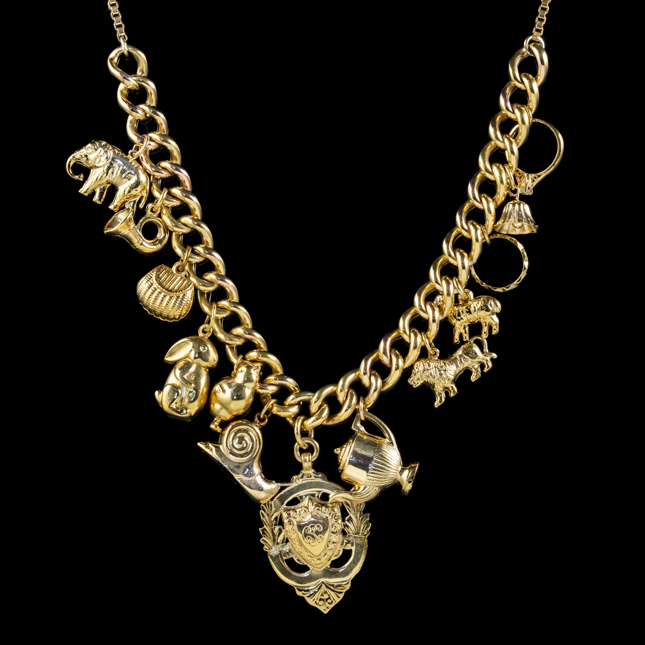Vintage Gold Charm Necklace 9ct Gold 12 Charms & Medallion Dated 1920