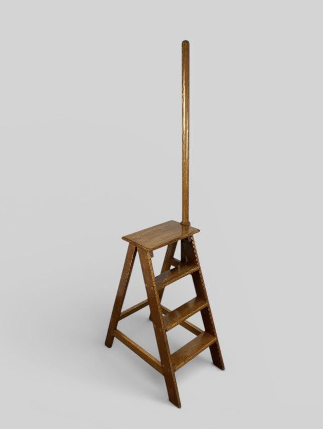 A sturdy and characterful set of vintage oak library steps, designed for both practical use and as a classic decorative accent for a home library or study. These steps feature a tall, integrated pole handle, providing essential stability and balance while reaching for higher shelves.