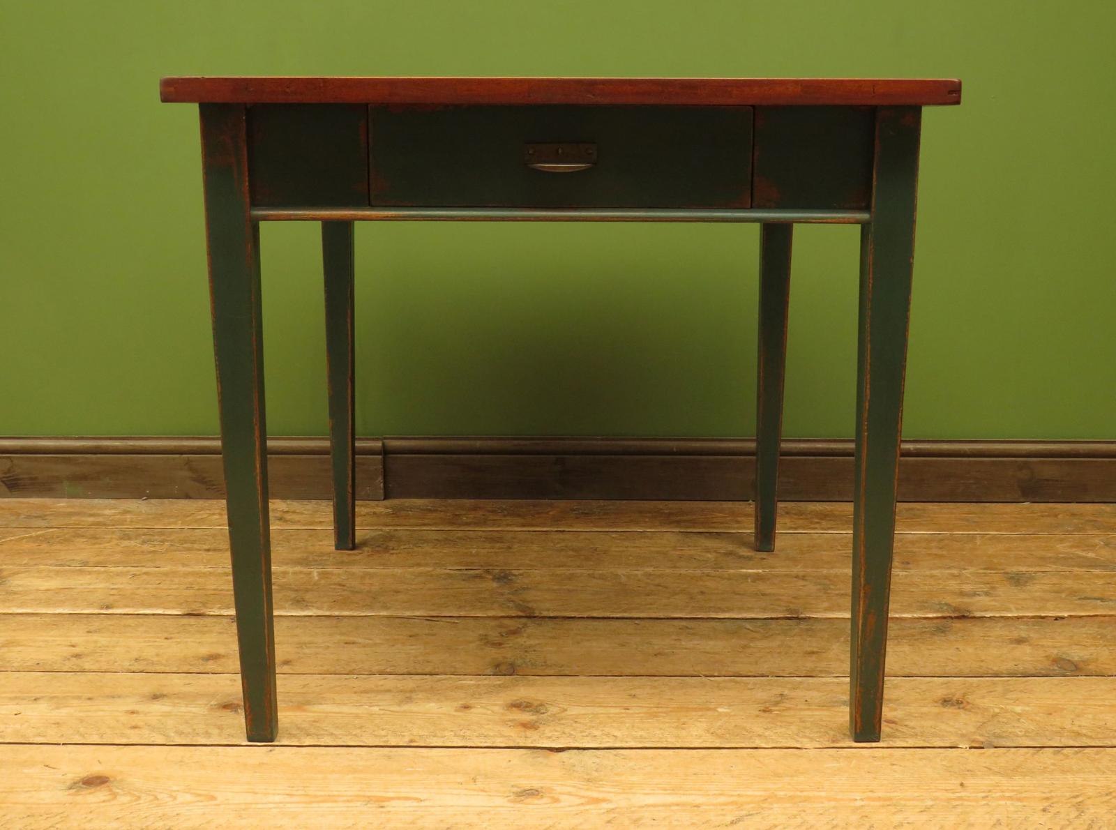Vintage Green Painted Square Kitchen Table With Drawer And Wooden Top