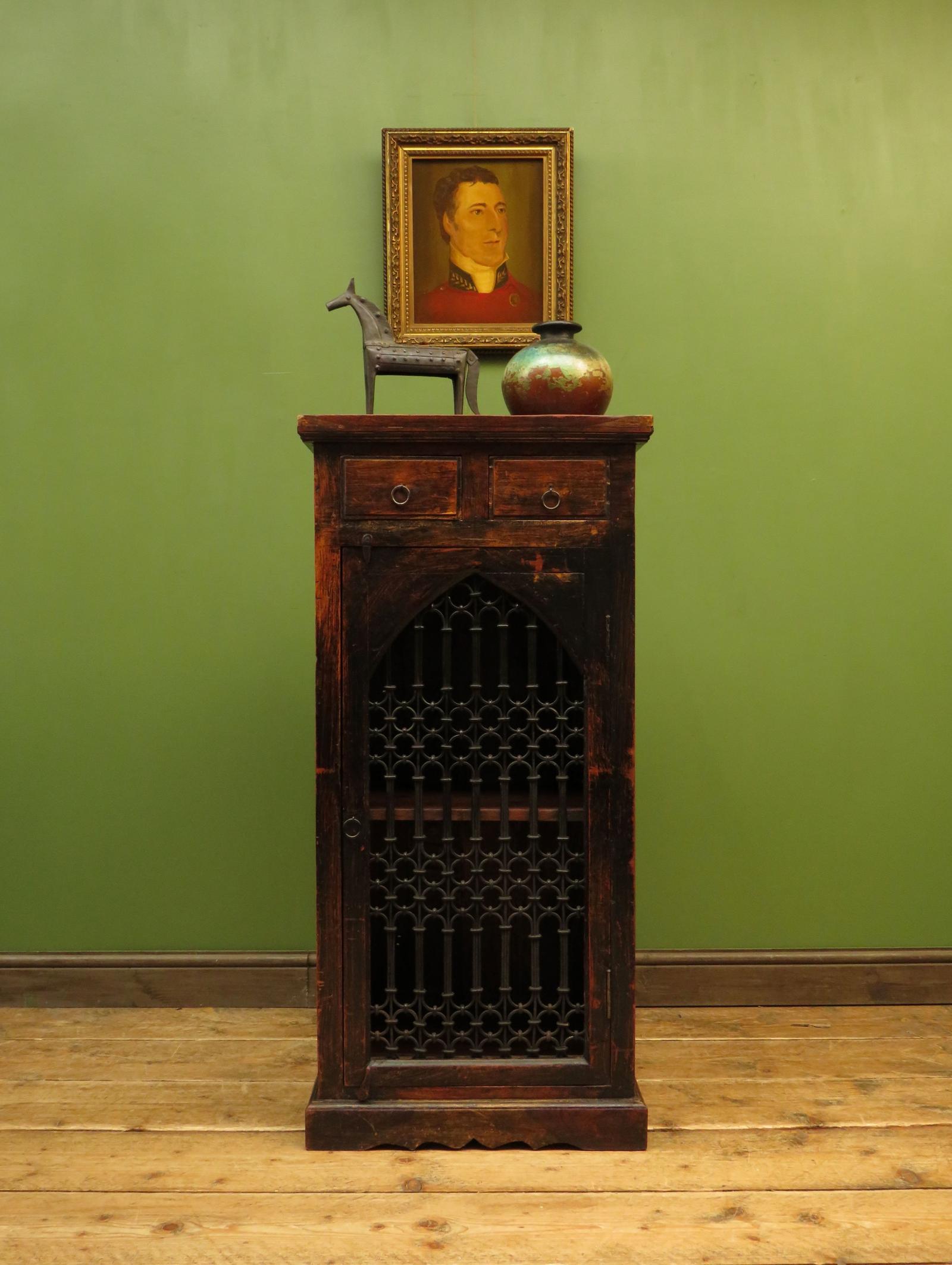 Vintage Indian Narrow Cabinet With Metal Grill Door