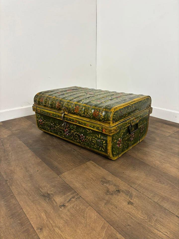 A charming vintage Indian metal trunk featuring beautiful hand painted decoration in rich green and yellow tones with delicate floral motifs. The aged paintwork and distressed finish give this piece wonderful character and an authentic vintage look.