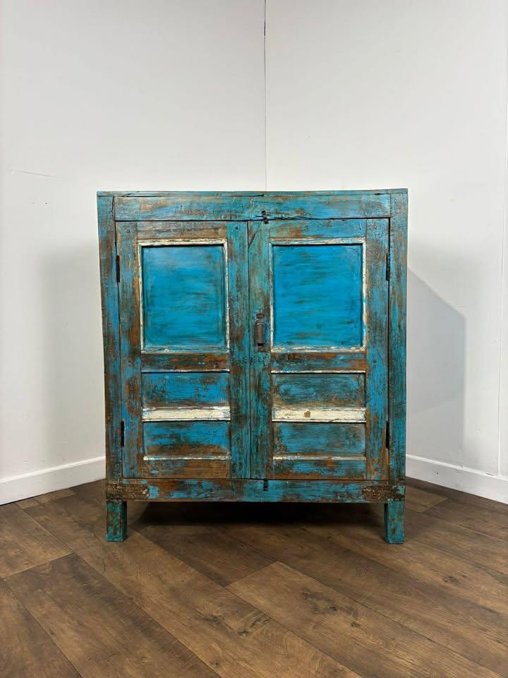 A beautiful vintage Indian cupboard crafted from solid reclaimed wood and finished in a striking distressed blue paint, giving the piece wonderful character and a truly rustic appearance. The layered worn finish reveals hints of natural timber beneath, creating a unique aged look that only reclaimed furniture can offer.