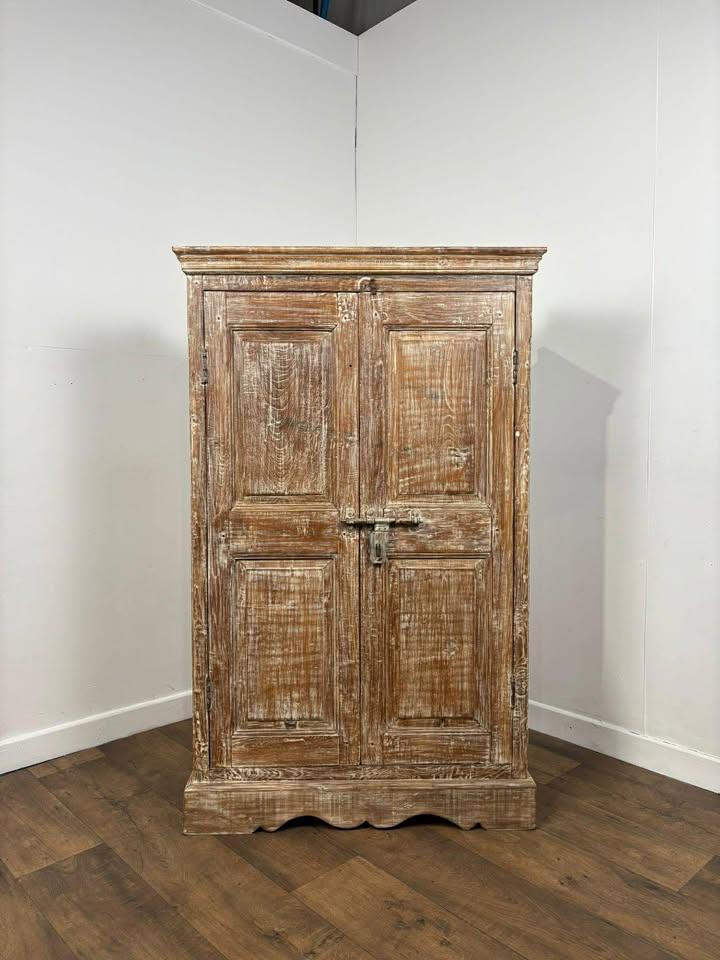 A beautiful vintage Indian wooden cupboard featuring a charming lime-washed rustic finish that highlights the natural grain and character of the timber. The aged surface gives the piece a wonderfully weathered appearance, making it ideal for rustic, farmhouse, or country-style interiors.