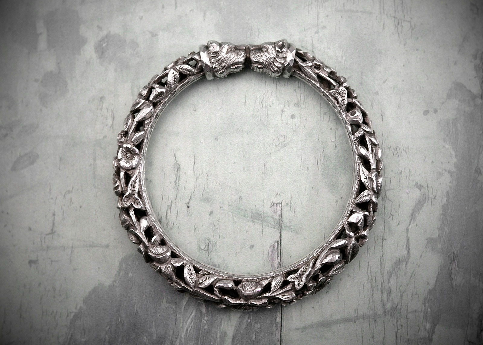 Vintage Indian Silver Lion Head Bangle Bracelet with Carved Openwork Flowers & Leaves