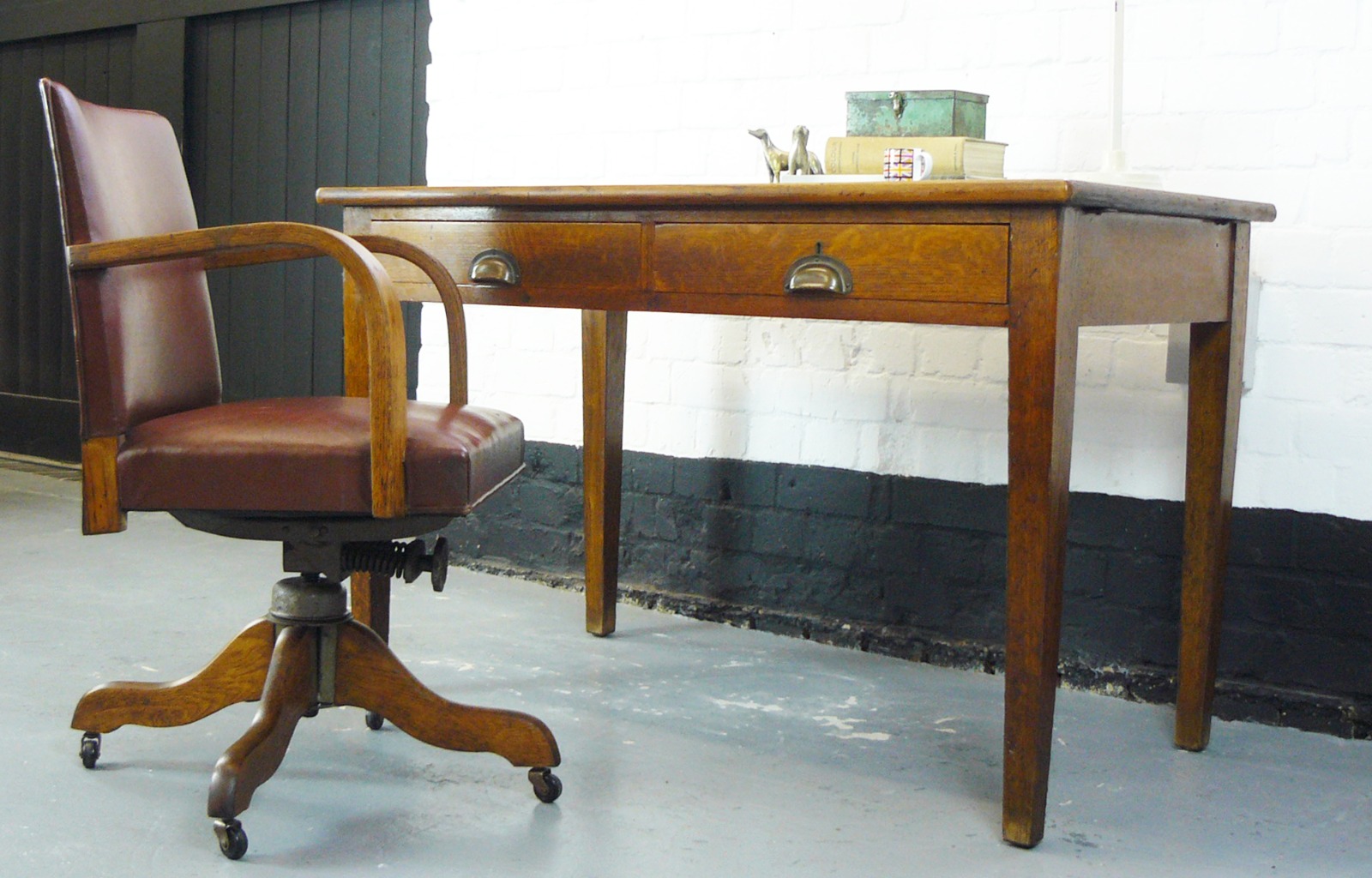 Vintage Industrial 1930 Government 2 Drawer Oak Desk, Green Top (1 of 1)