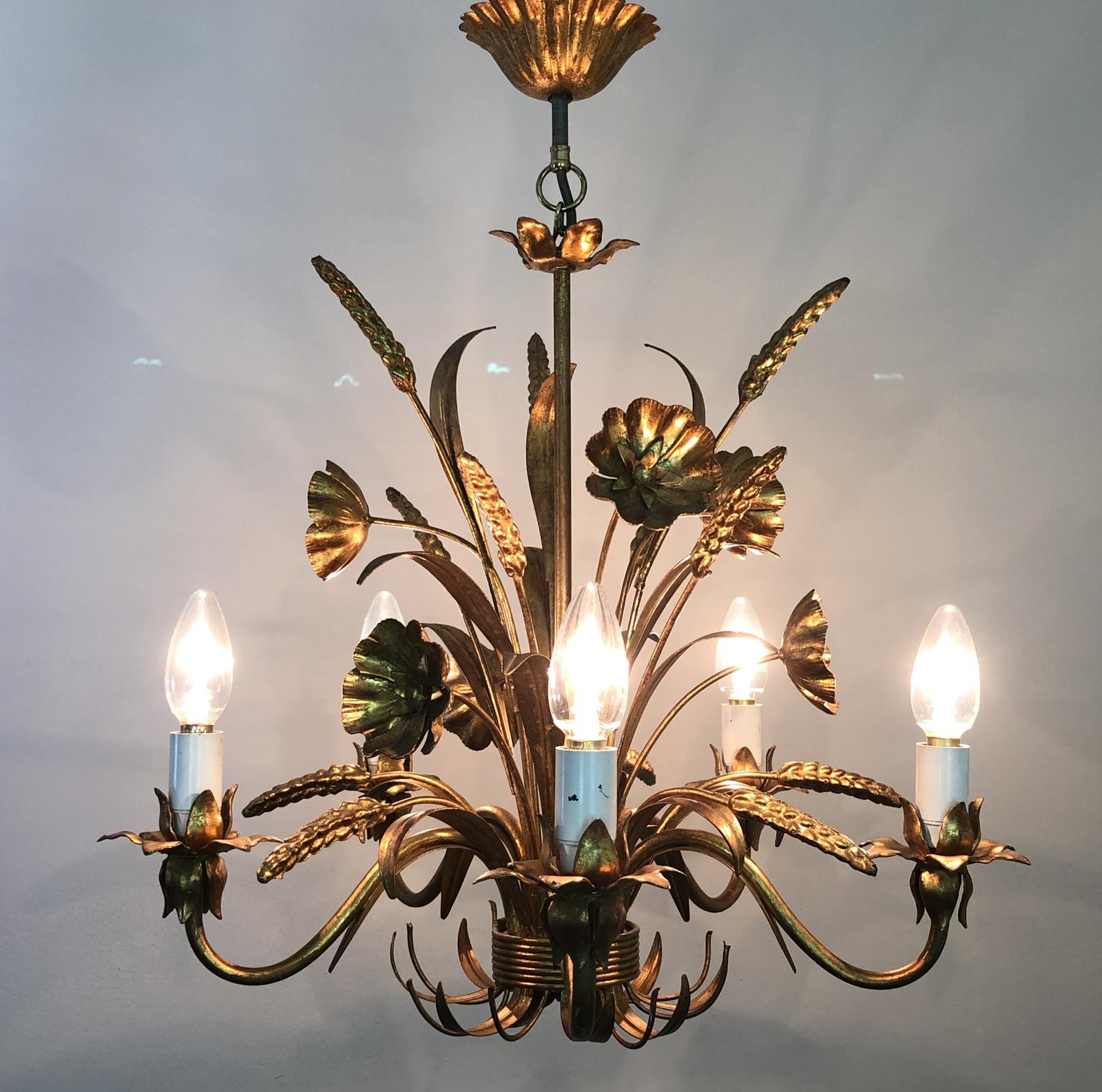 Vintage Italian 5 Arm Gilt Wheatsheaf & Floral Toleware Ceiling Light Chandelier