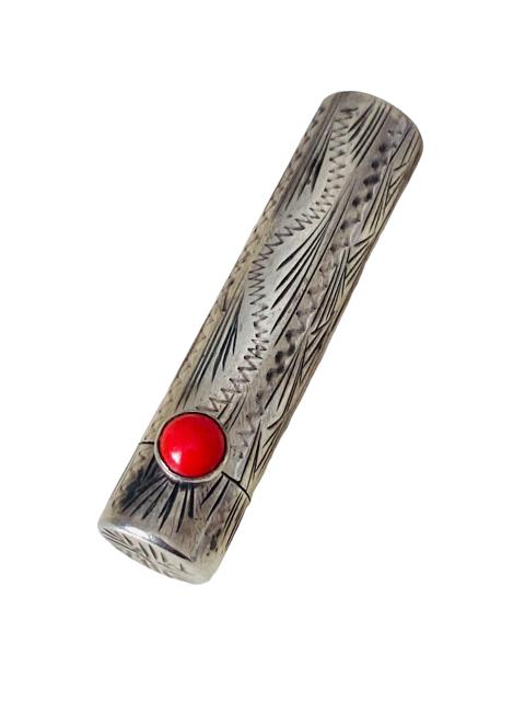 Vintage Italian Bright Cut Continental Silver Lipstick Case / Holder with Coral Glass Cabochon c.1940