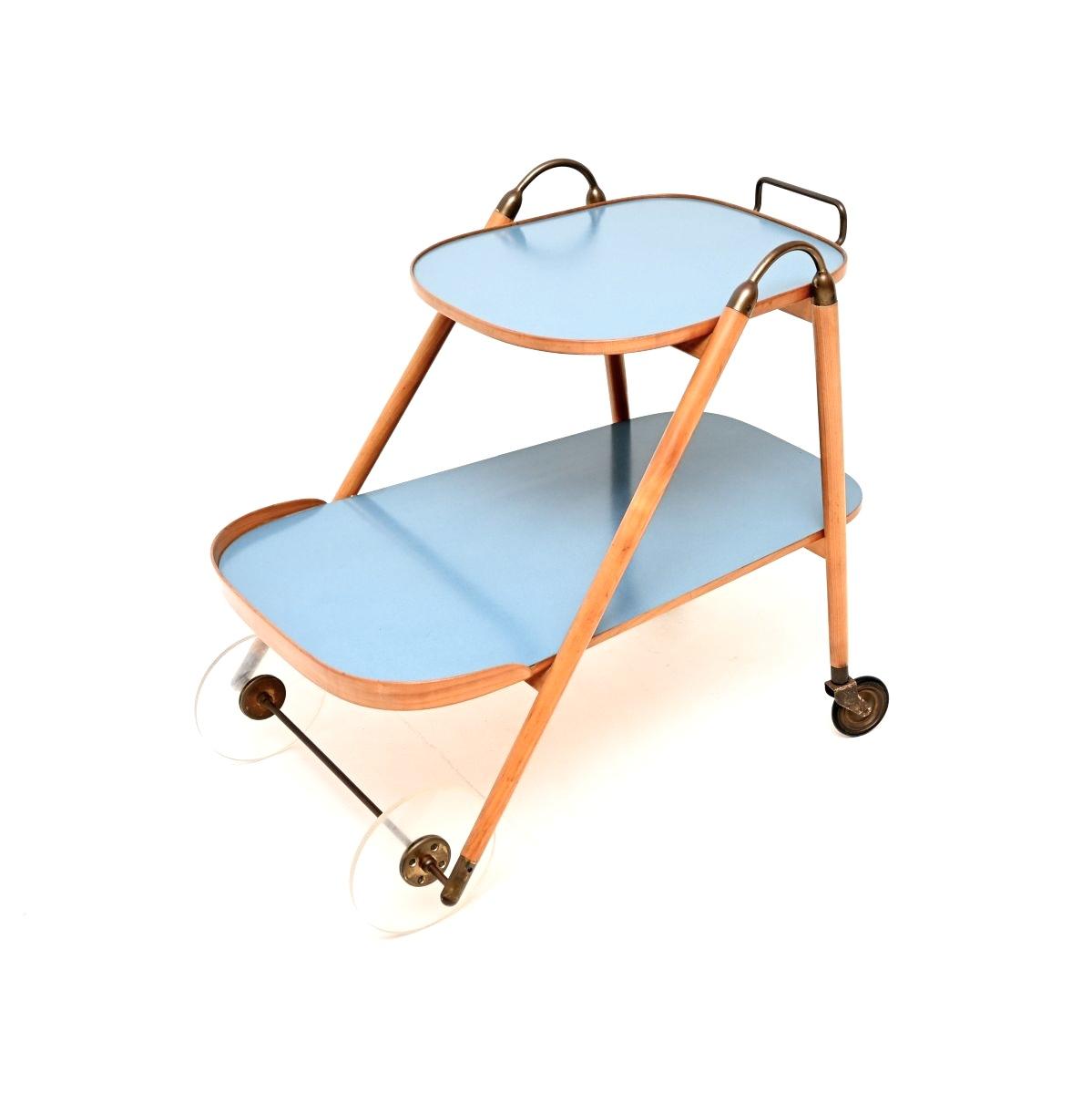 This has a beautiful and striking design, the quality is superb. The frame is solid cherry wood, with light blue Formica topped surfaces. There is solid brass trim and two lovely clear acrylic wheels at the front, with brass wheels at the back.