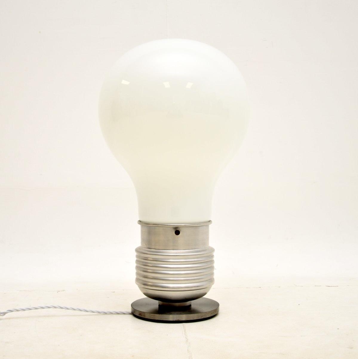 It is beautifully designed as an oversized lightbulb, with the white glass bulb shaped shade attahced to a brushed steel base. The quality is amazing, the condition is excellent.