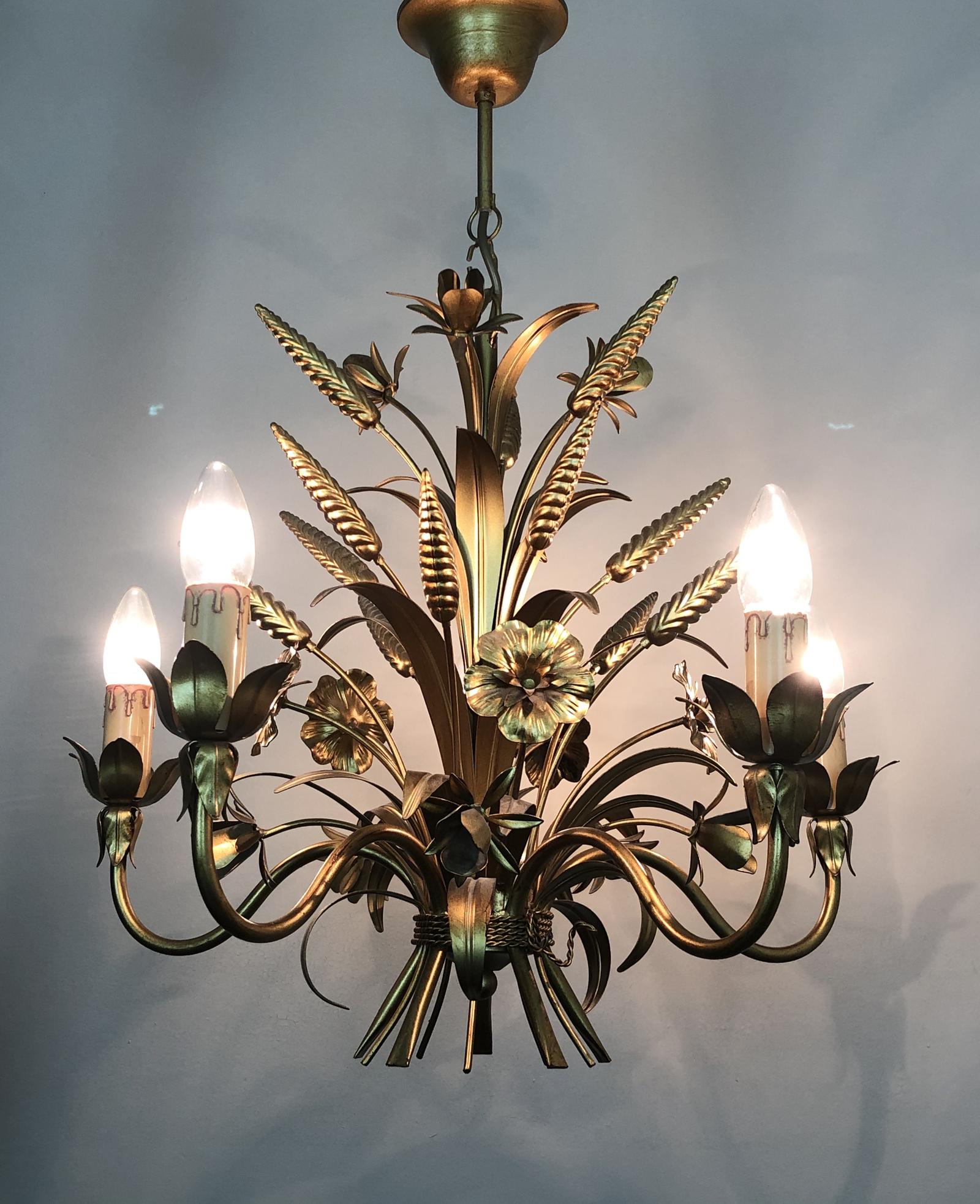 Vintage Italien 5 Arm Wheatsheaf & Floral Toleware Ceiling Light Chandeleir