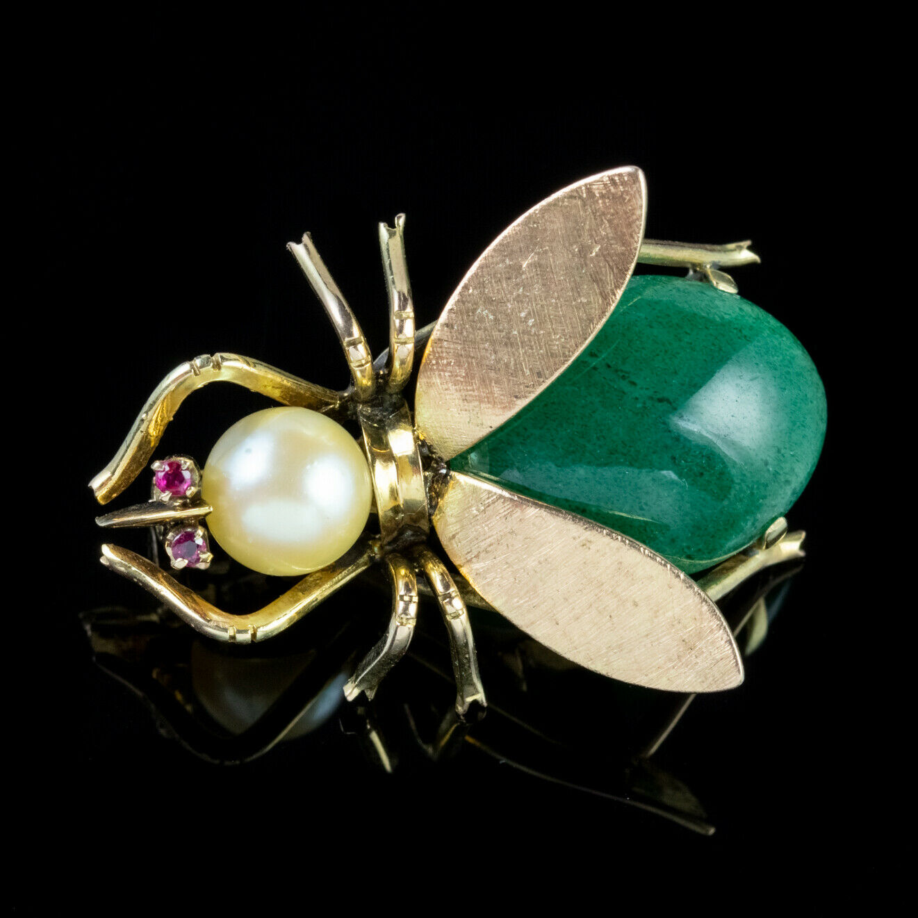 Vintage Jade Insect Brooch 18ct Gold Pearl Ruby c.1970