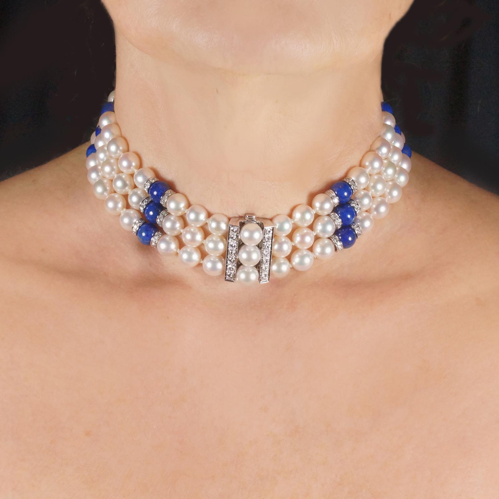 Vintage John Van Der Vet Pearl Necklace Lapis Lazuli & Diamond 3 Strand Steltman Juwelier Pearl Choker (1 of 11)