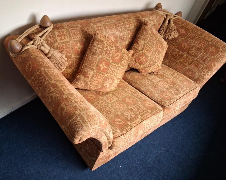 This vintage Knole sofa is a classic piece of antique furniture from the United Kingdom, featuring a high back with drop arms secured by finals and tie back a multicoloured design, this sofa exudes timeless charm and sophistication. With its elegant design and craftsmanship, this sofa is sure to make a stylish statement in any living room. Measuring 90cm in height, 97cm in length, and 207cm in width with the seating width 127cm and seat height 54cm , this Knole sofa is a true representation of traditional British furniture design. the arms do drop to make if needed a more relaxed sofa for a afternoon snooze , they also can be unscrewed to make this sofa very easy to get through tighter spaces does have odds snags on cotton